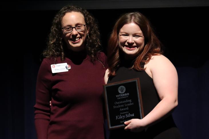 I am so pleased to present the first of this evening’s Outstanding Student Leader Award. This recipient currently serves as the President of our Student Government Association and has previously served as Vice President and in other roles. Through her work with SGA, this recipient has made significant changes for students - examples include her collaborations with then President (and one of tonight’s emcee’s Logan Janscurak) to bring about a partial remodel/refresh of the Viterbo library and a revision of the SGA Constitution, and her work with other members of SGA this academic year to bring the V-Hawk SAFE Campus Safety app to campus (coming soon!), and the refresh of the Port. While SGA leaders are not able to serve in leadership roles in campus organizations due to conflicts of interest in budget allocations and the significant requirements of the position, this recipient has been a strong leader in Platinum Edition and the music theatre department as a whole. She has been an articulate and active participant in Viterbo University Board of Trustees meetings, working tirelessly - and very effectively - to advocate for students and educate Board members about student needs and experiences. We've been incredibly blessed to have Kiley Silva in leadership - Viterbo would not be the campus it is today without her hard work and delightful presence. Thank you, Kiley!